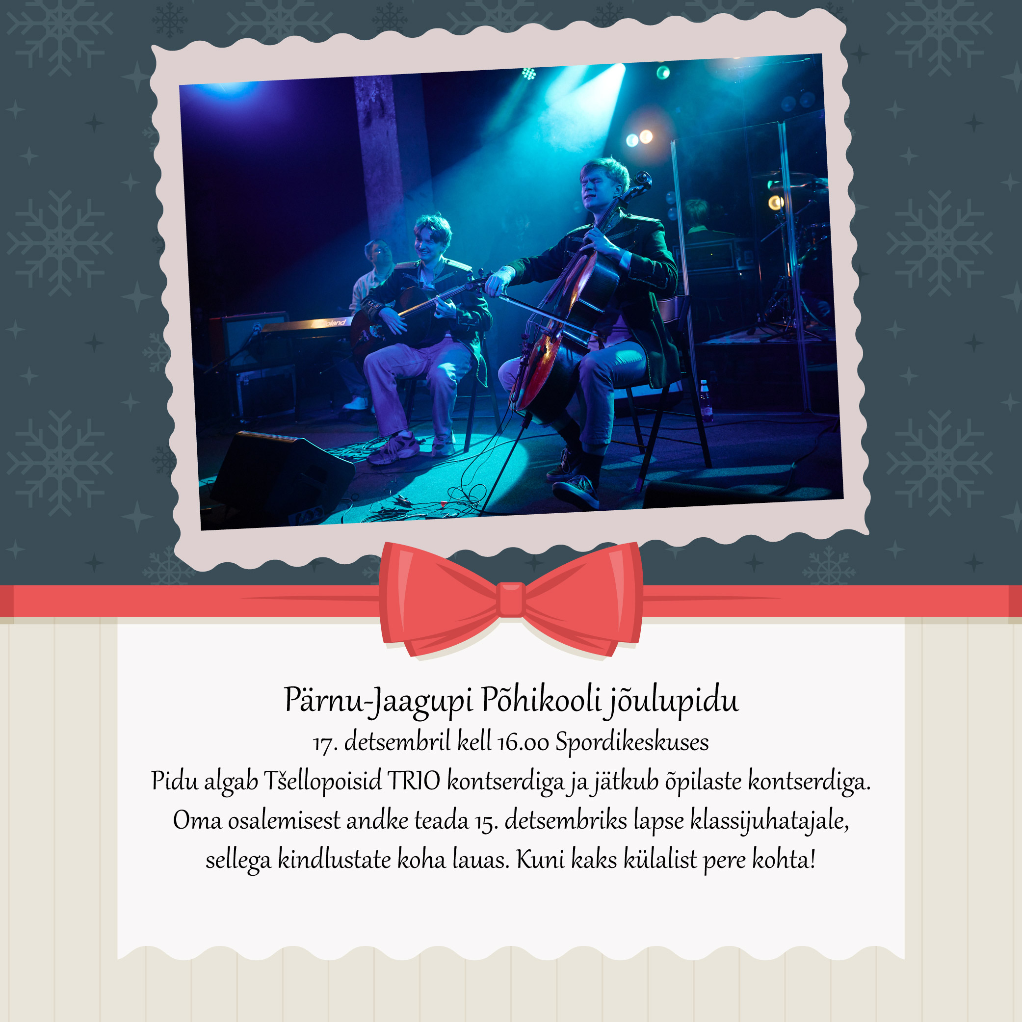 Oma osalemisest andke teada 15. detsembriks lapse klassijuhatajale, sellega kindlustate koha lauas. Kuni kaks külalist pere kohta!