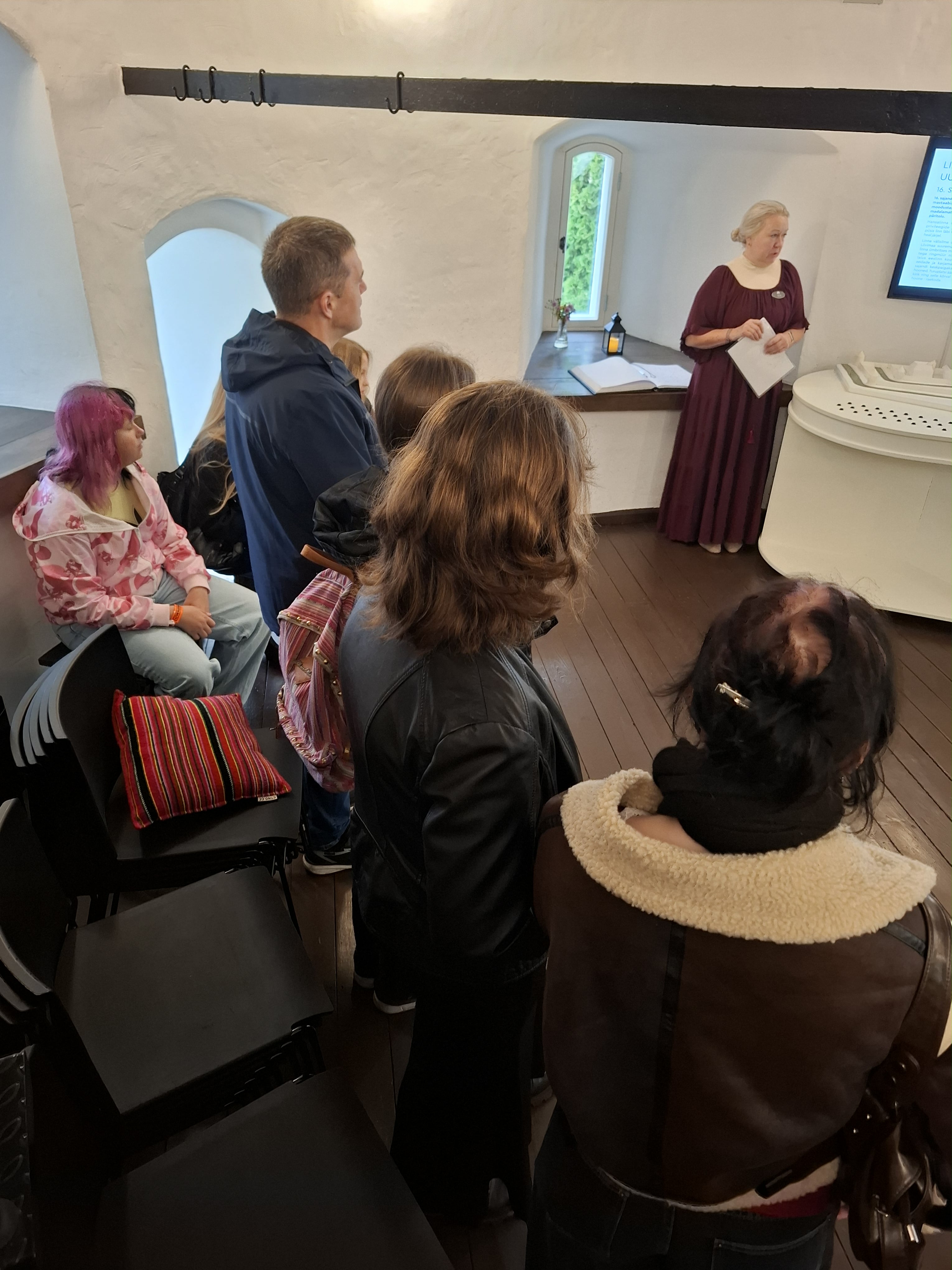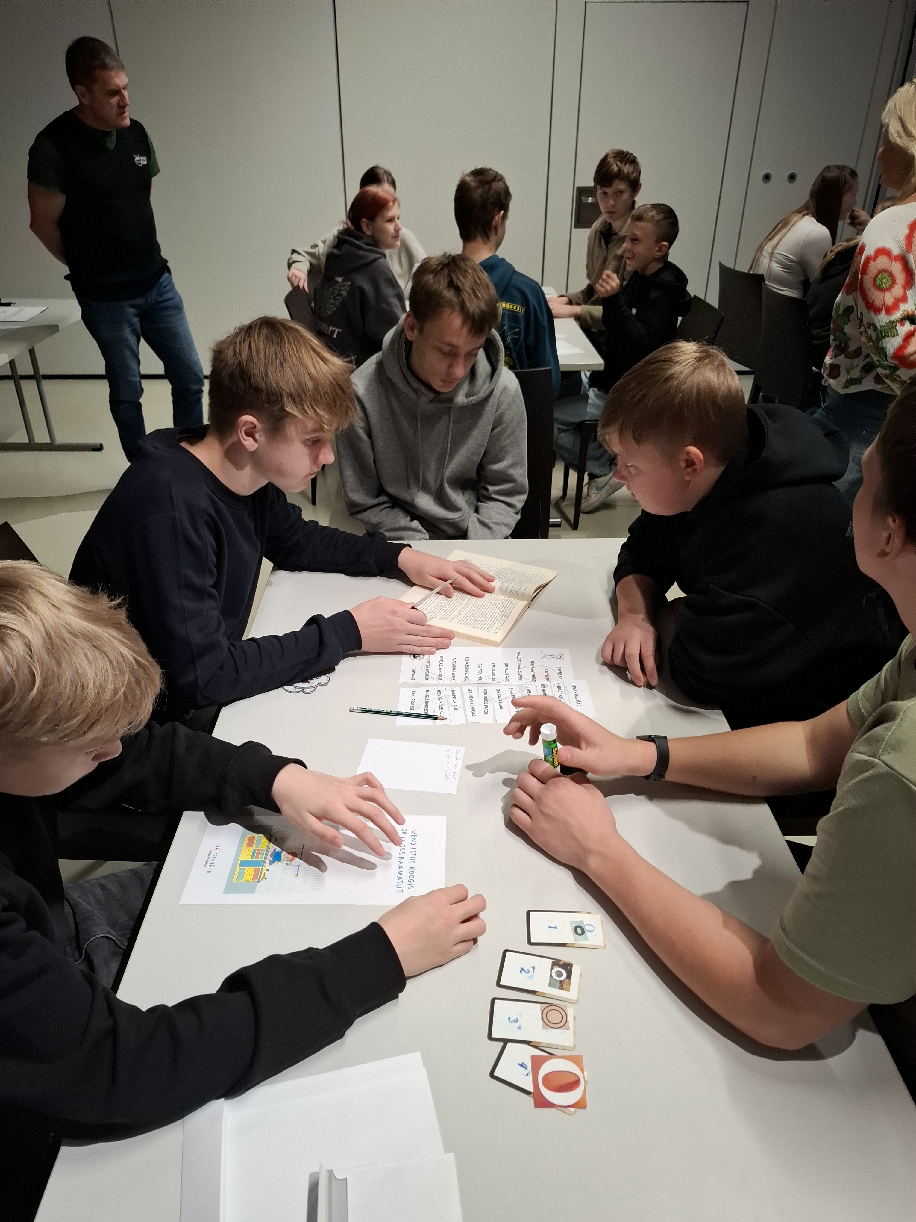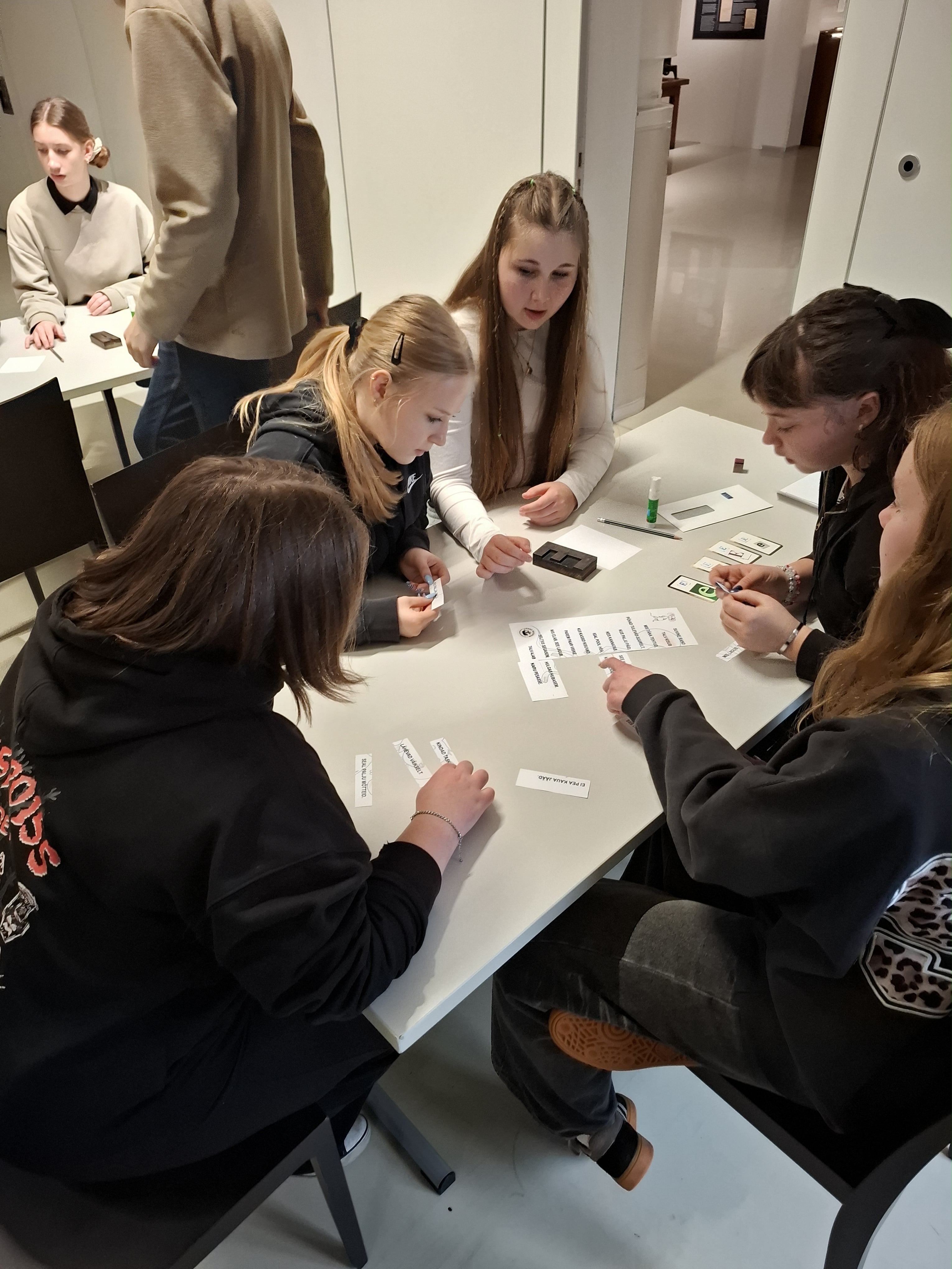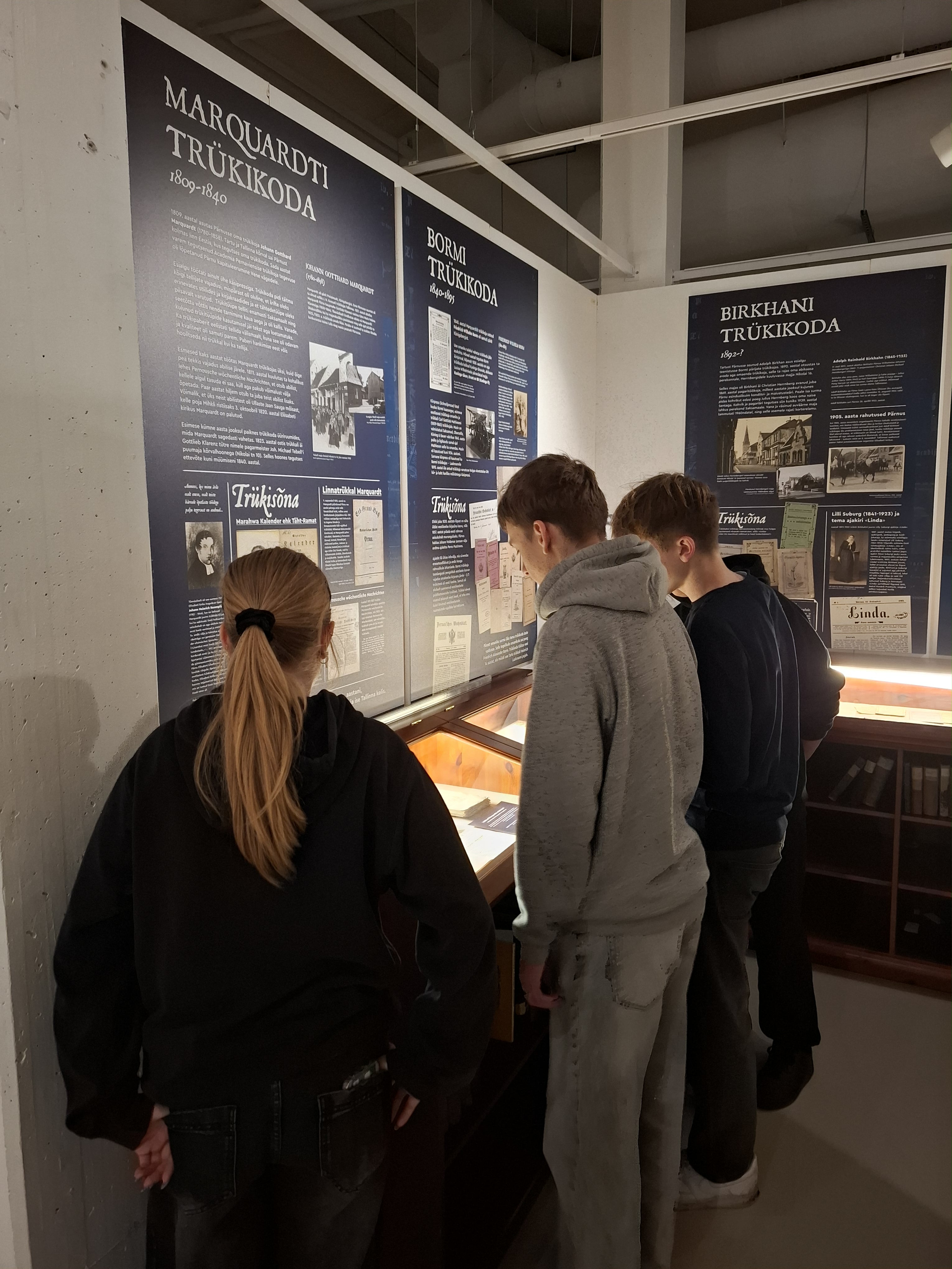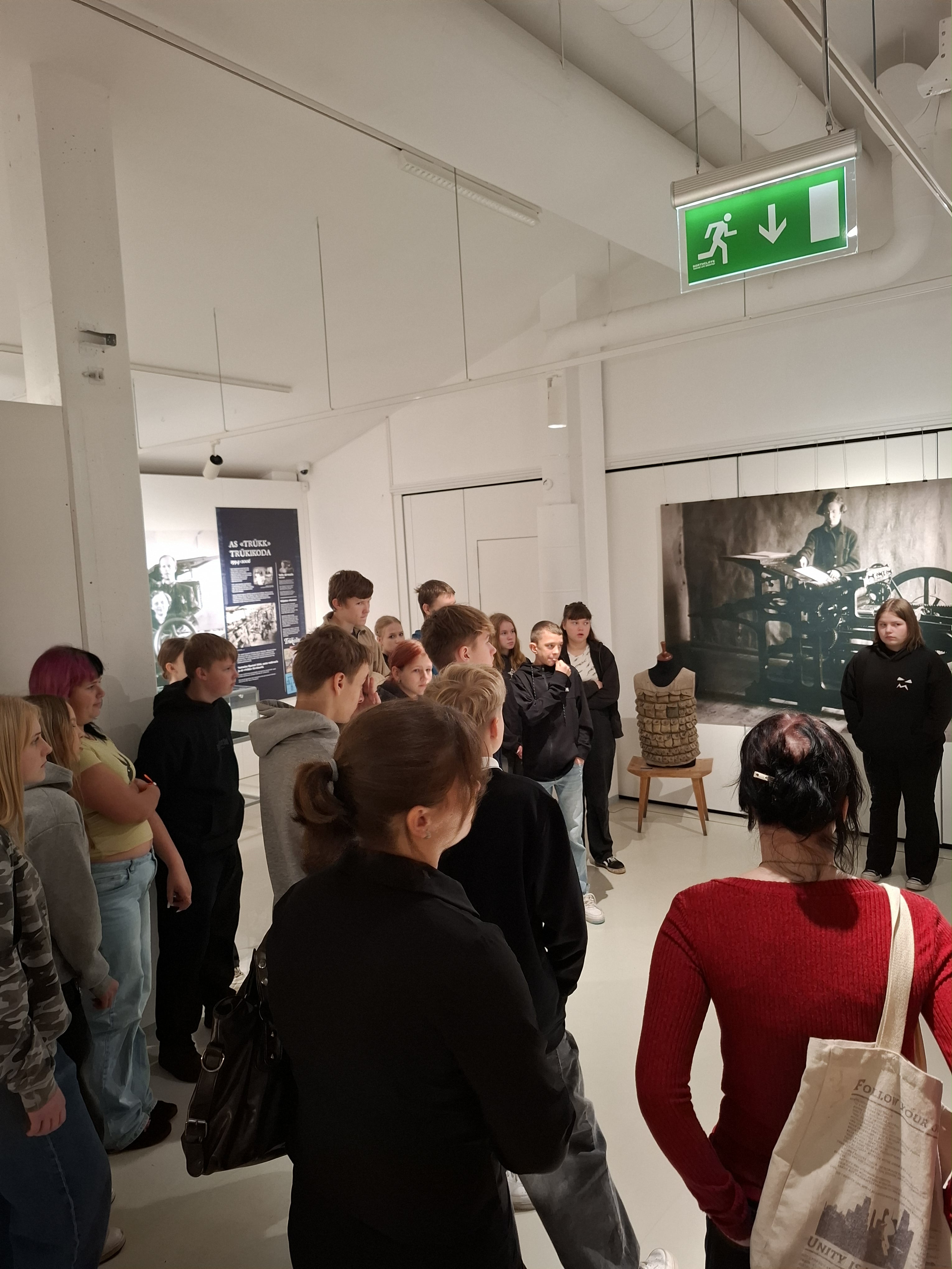 Muuseumis oli alumistel korrustel ümberkorraldustööd, seega võeti meid vastu kõige ülemisel korrusel. Seal toimus ka trükikunsti näituse vaatamine ning töötuba, mis tegi meie 20 õpilasega seltskonna 4 võistkonnaks ning nad pidid otsima trükivigu, mis muudavad teksti tähendust väga oluliselt. Meie noored näitasid, et suudavad teha head koostööd omavahel ja tulid hästi toime muuseumis pakutuga. Näituse üks huvitavaim asi oli trükkija vest, millel pidid olema taskud kõikide tähtede jaoks.