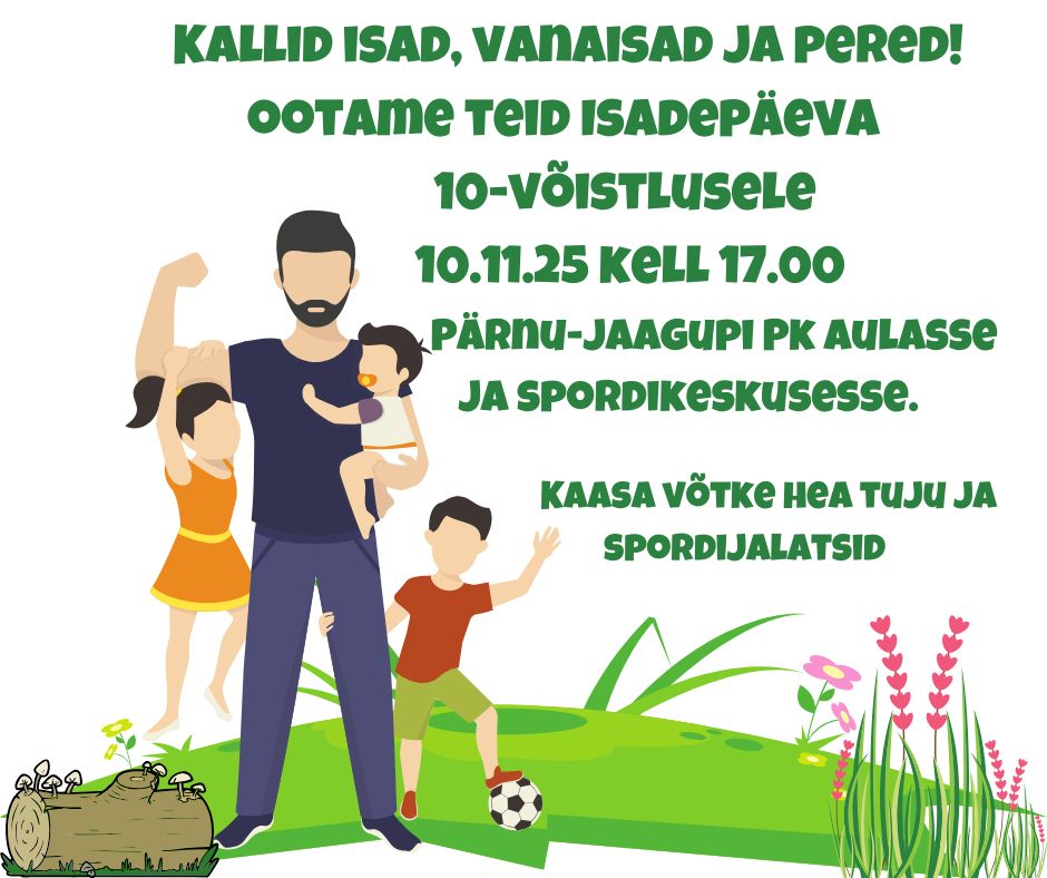 Kallid isad, vanaisad ja pered! Ootame teid isadepäeva 10-võistlusele 10.11.25 kell 17.00 Pärnu-Jaagupi PK aulasse ja spordikeskusesse.