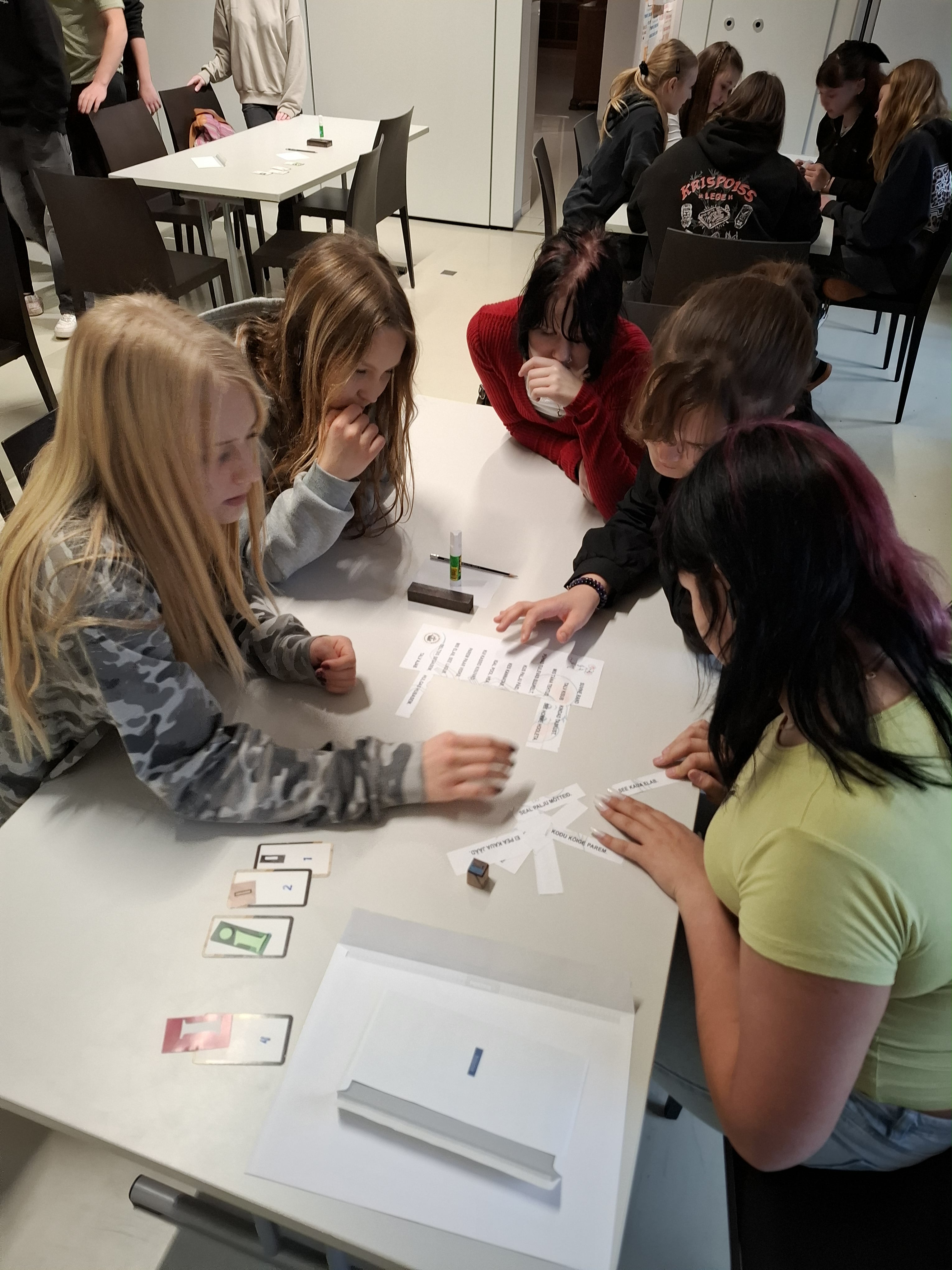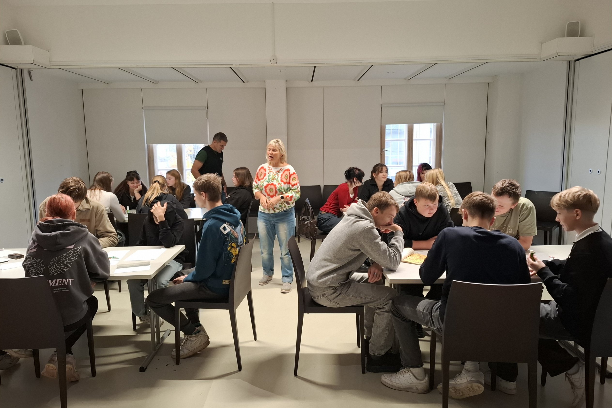 Muuseumis oli alumistel korrustel ümberkorraldustööd, seega võeti meid vastu kõige ülemisel korrusel. Seal toimus ka trükikunsti näituse vaatamine ning töötuba, mis tegi meie 20 õpilasega seltskonna 4 võistkonnaks ning nad pidid otsima trükivigu, mis muudavad teksti tähendust väga oluliselt. Meie noored näitasid, et suudavad teha head koostööd omavahel ja tulid hästi toime muuseumis pakutuga. Näituse üks huvitavaim asi oli trükkija vest, millel pidid olema taskud kõikide tähtede jaoks.