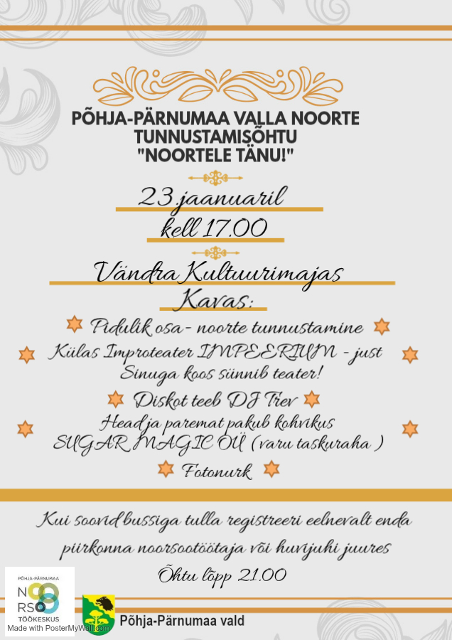Sellel reedel 23. jaanuaril toimub Vändra Kultuurimajas Põhja-Pärnumaa valla noortele tunnustusõhtu "Noortele tänu!".