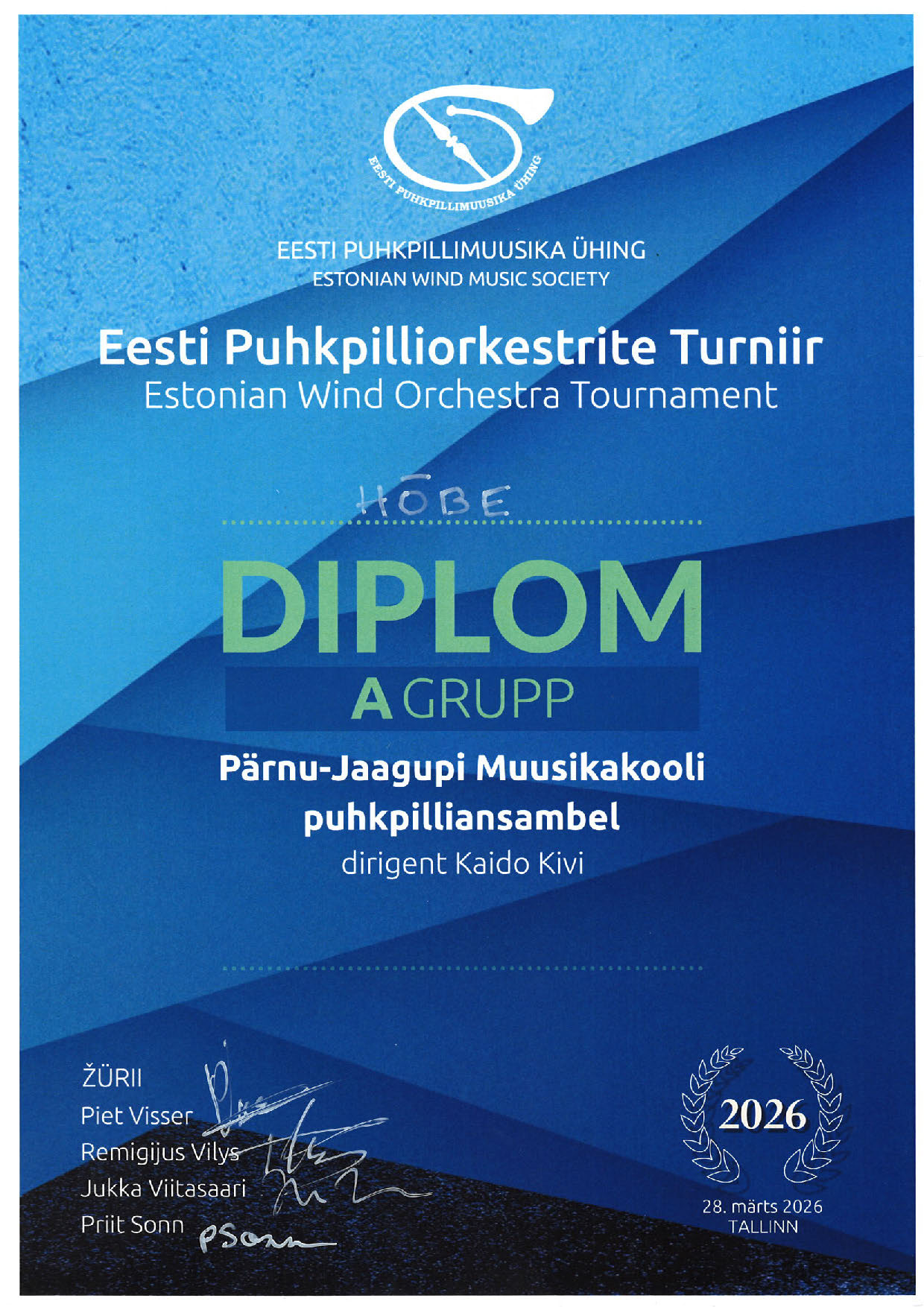 28.03.2026 toimus Tallinnas, Estonia Kontserdisaalis konkurss Eesti Puhkpilliorkestrite Turniir 2026.